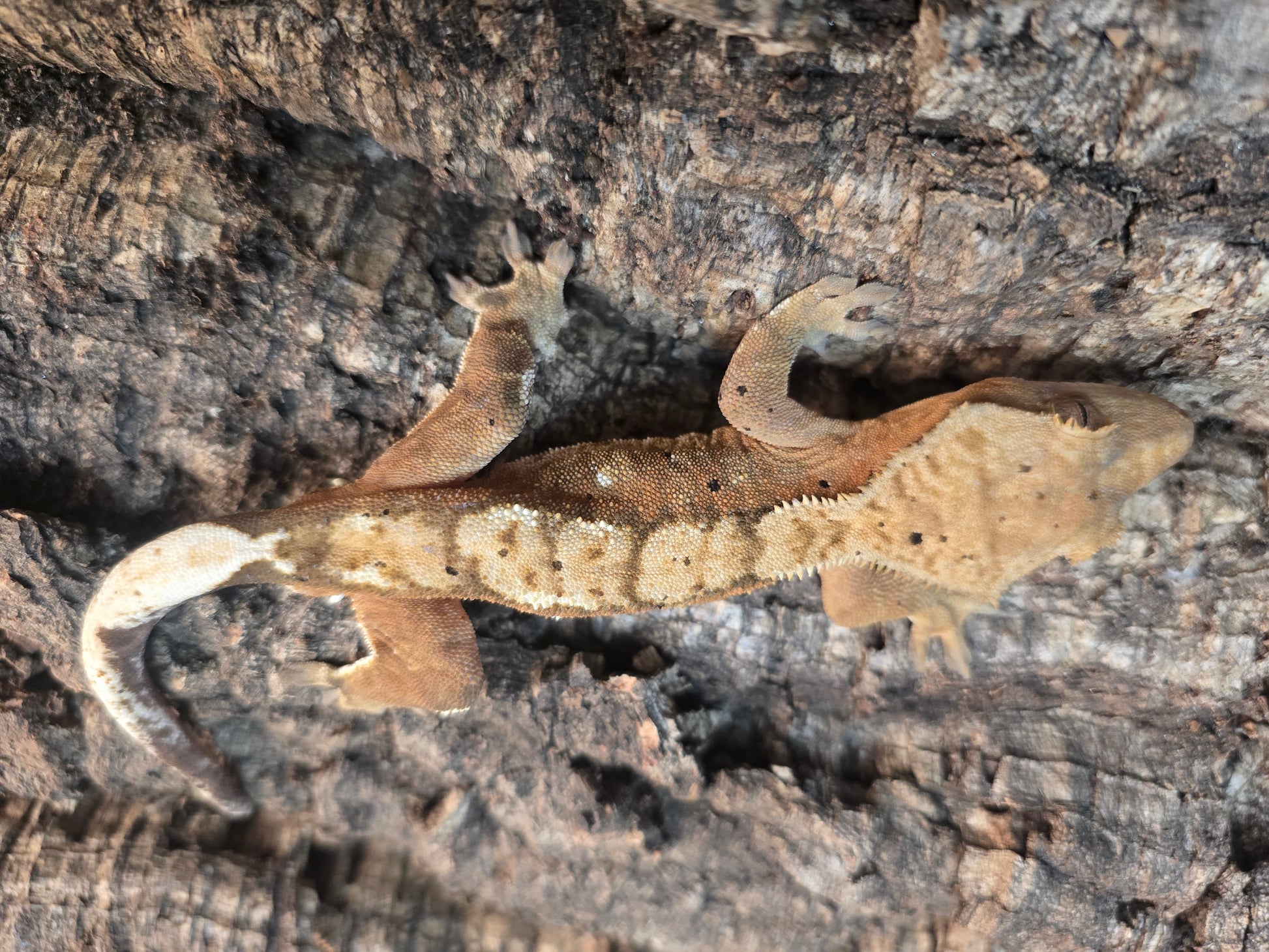 Beautiful male tricolor flame. Bright oranges accented by dark green with a cream dorsal. Has visual dalmation, knee cap, and snowflake traits.